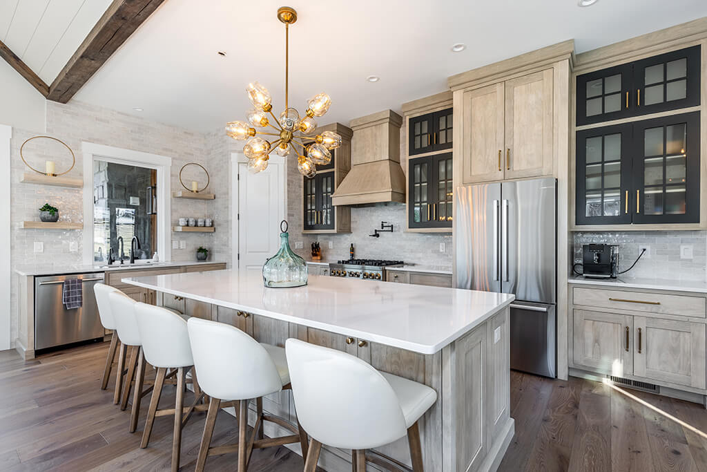 This custom home offers a modern take on the classic lake house style. We focused on incorporating natural materials like the stained cedar beams and natural stone accents into a modernized architectural concept. Unique features like the floating staircase make this project memorable. Windows on the back of the house were maximized to take advantage of the beautiful lake view.